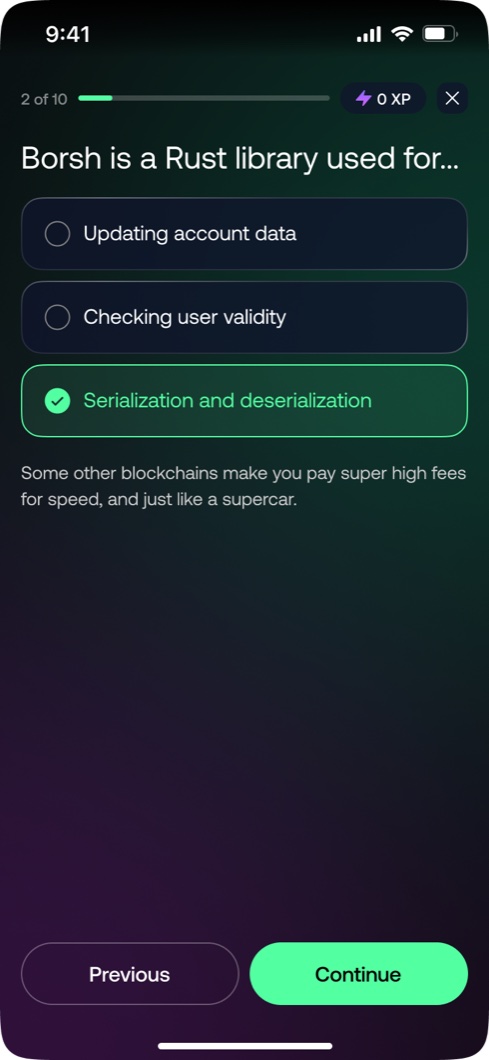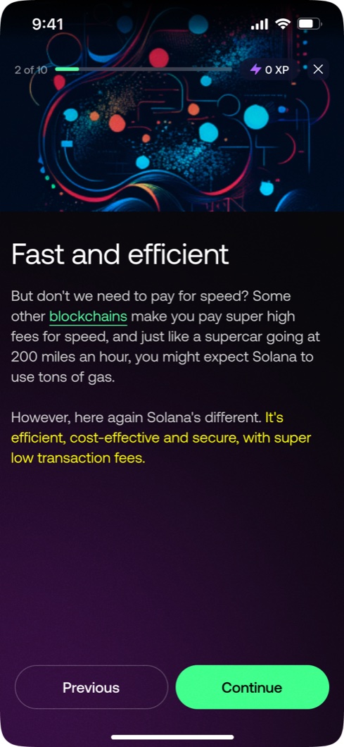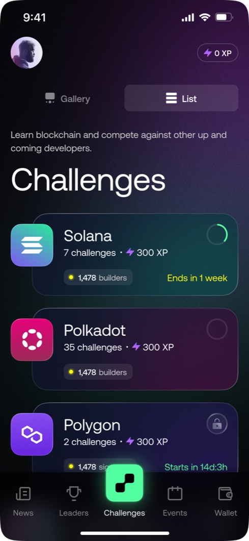A full platform redesign for one of the world's leading blockchain learning apps. Six weeks from brief to handoff, built at Unfold. UX, UI, and a complete design system.