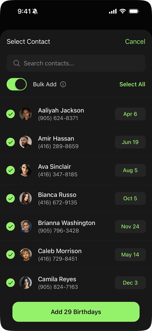The worst part of any app that requires manual data entry is onboarding. You download it, feel good for five minutes, then abandon it because typing 70+ birthdays by hand isn't fun. Most apps accept it.