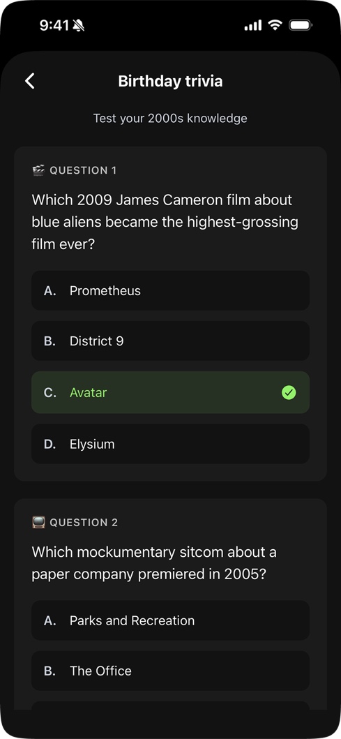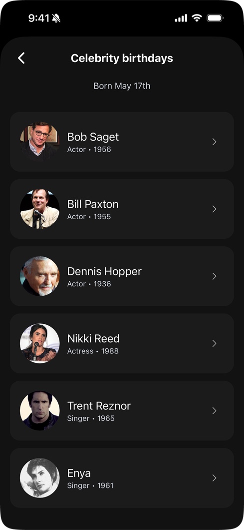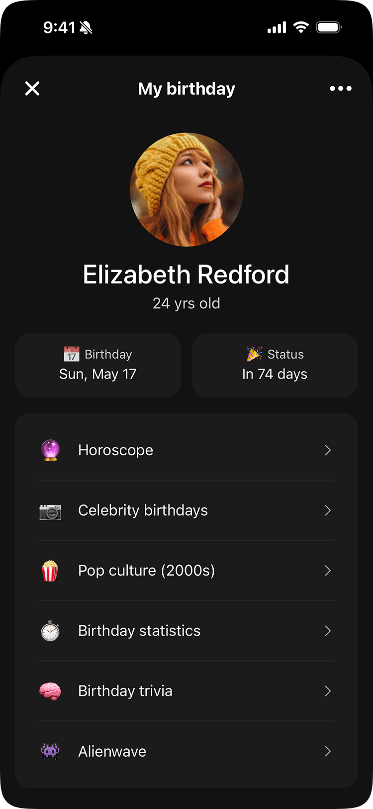 The Birthday Hub was the answer. It's a completely separate experience built around the user's own birthday: a curated list of celebrities who share their exact birthday, pop culture throwbacks from their birth decade, birthday statistics, and a hidden easter egg: a Space Invaders-style game called Alienwave. The daily horoscope is a Pro feature, but the Hub itself is available to everyone. The rest of the app is about remembering other people. The Hub makes it about you.