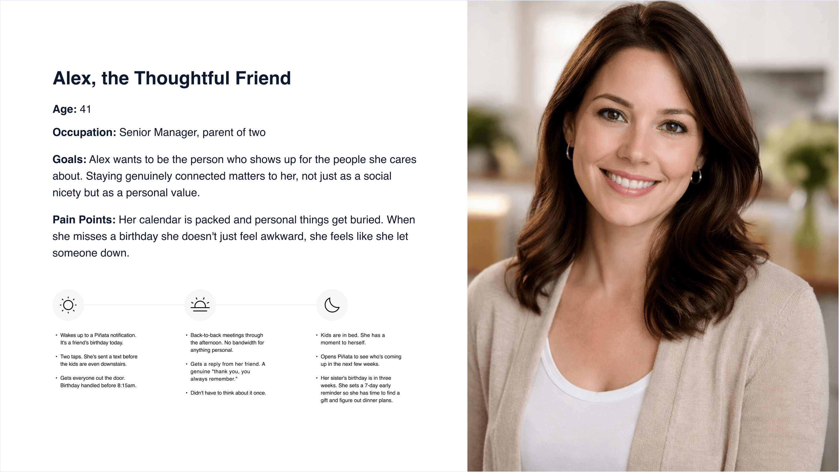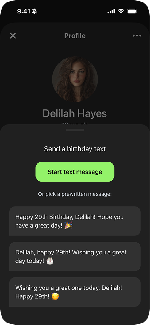 Two profiles kept showing up. One is personal: a busy professional or parent who wants to show up for the people in their life without it becoming another thing on their plate. The other is professional: someone who manages client relationships and understands that a birthday message is one of the most effective client touchpoints they have. The motivations are different. The problem is the same.