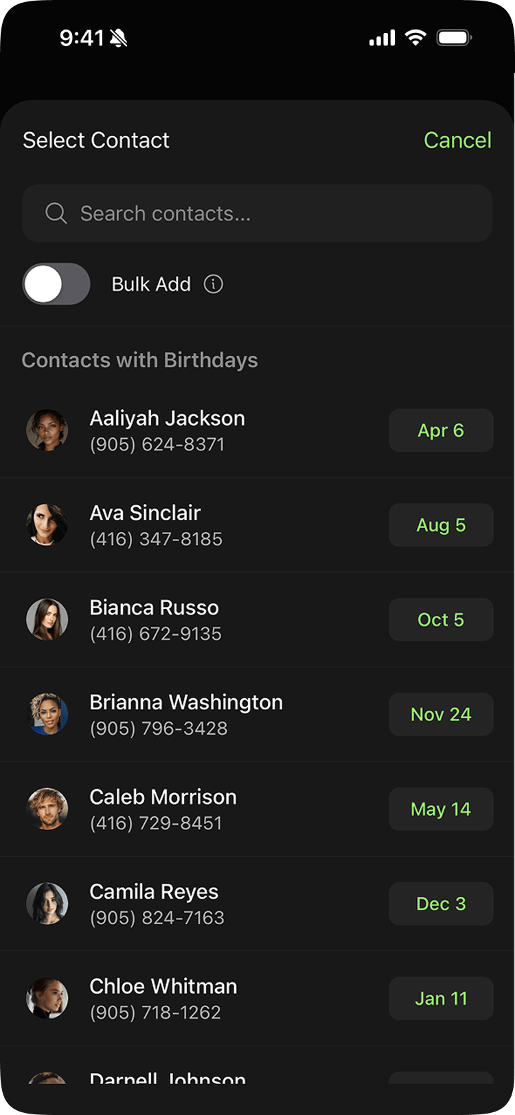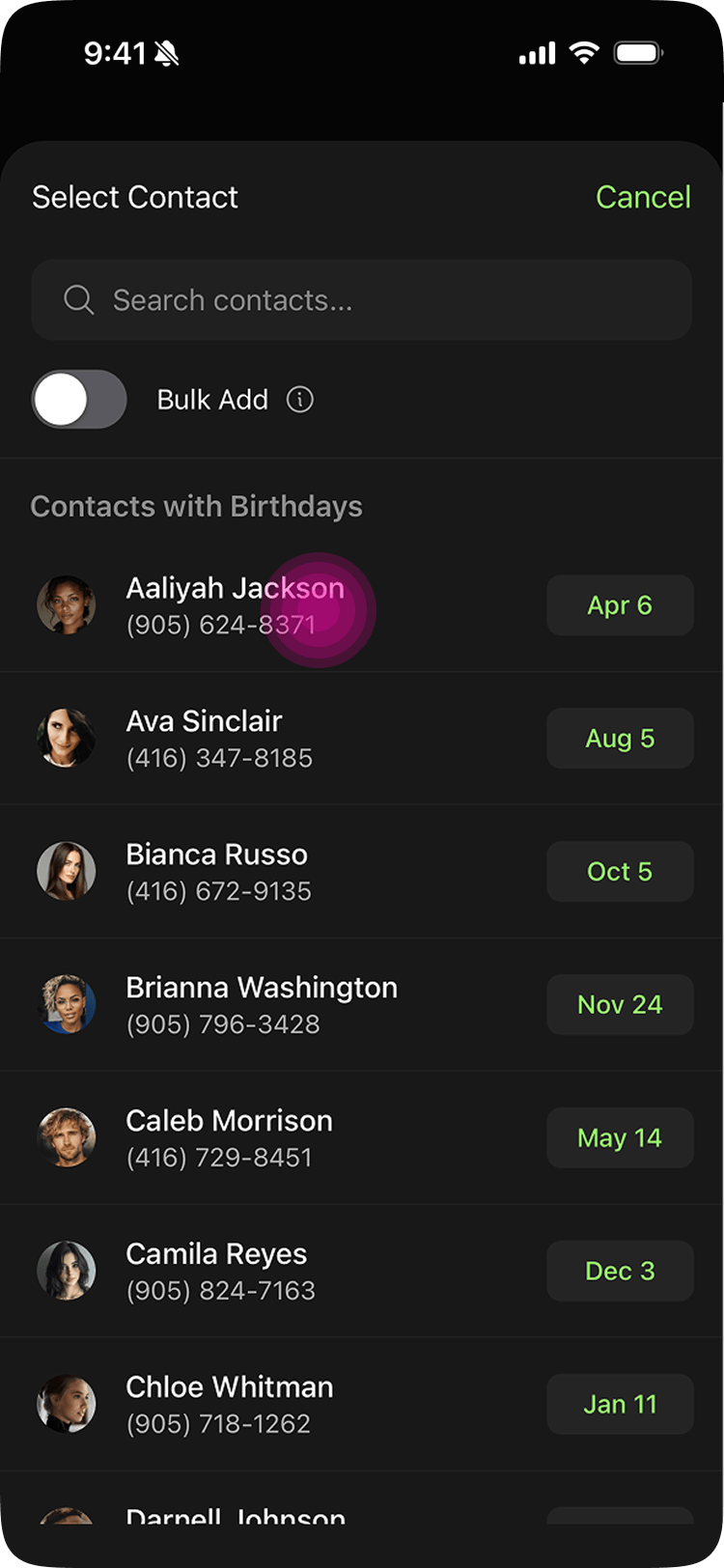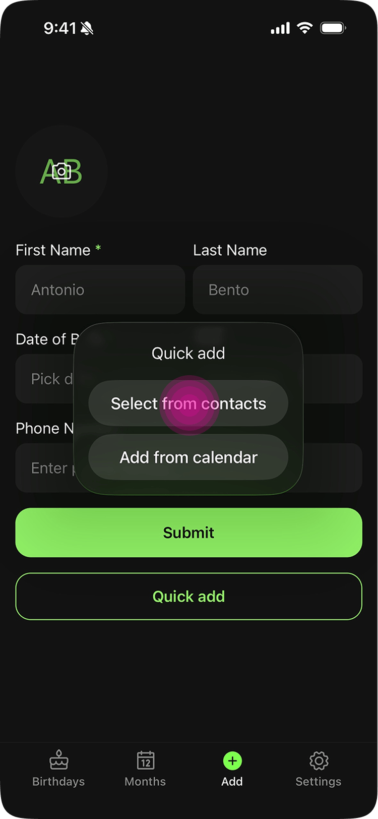 Piñata's answer was Quick Add. Instead of typing everything manually, you tap a contact from your phone or calendar, the birthday info pre-fills automatically, and you hit submit. No typing. Pro users can go further with Bulk Add, which lets them add multiple contacts at once.