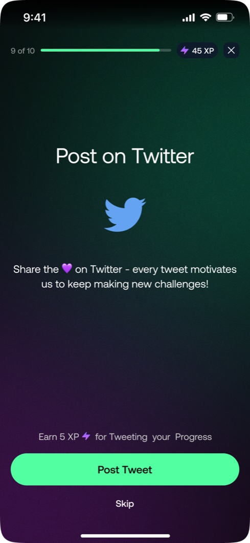 We flipped onboarding so the first challenge comes before sign-up. Users experience value first, then register at completion. Friction drops, intent is higher, and the moment feels earned.