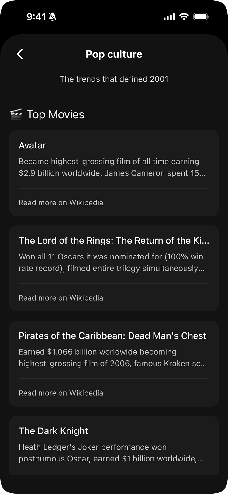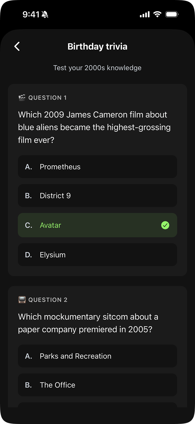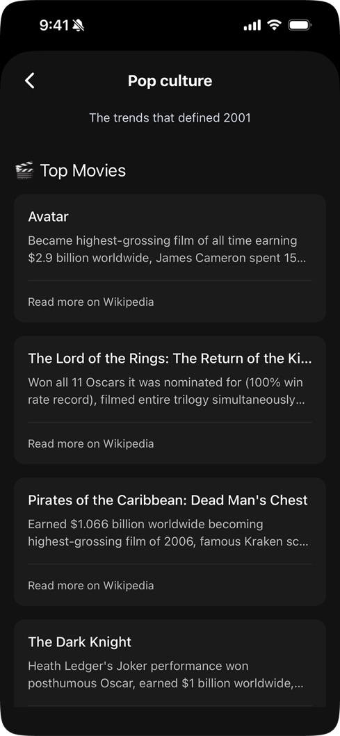 The Birthday Hub was the answer. It's a completely separate experience built around the user's own birthday: a curated list of celebrities who share their exact birthday, pop culture throwbacks from their birth decade, birthday statistics, and a hidden easter egg: a Space Invaders-style game called Alienwave. The daily horoscope is a Pro feature, but the Hub itself is available to everyone. The rest of the app is about remembering other people. The Hub makes it about you.