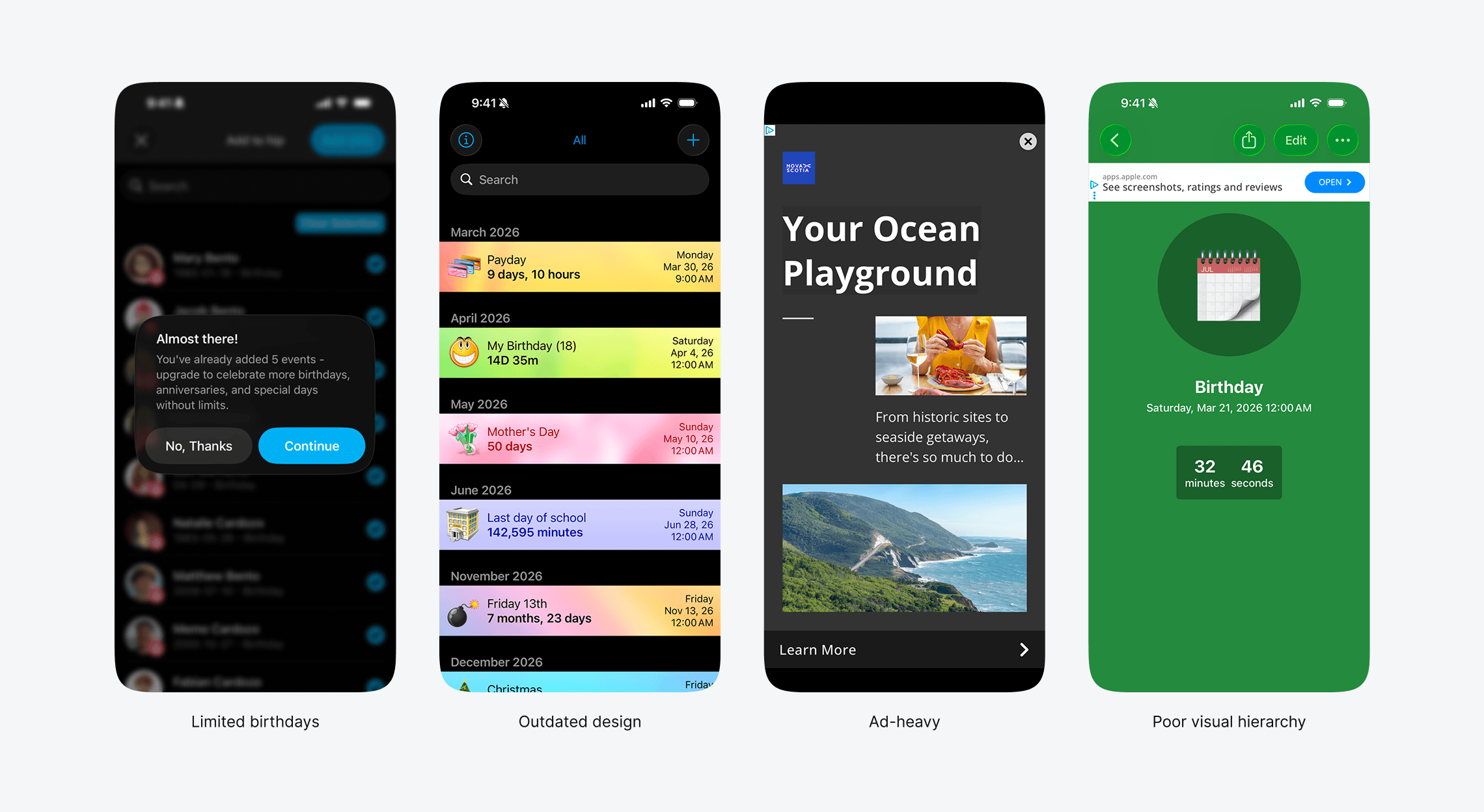 A lot of birthday apps gate the most basic feature behind a paywall. Add five birthdays, then pay. That's a trust violation. If the fundamental thing doesn't work until you pay, you've already broken the contract.