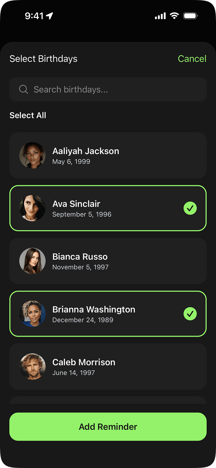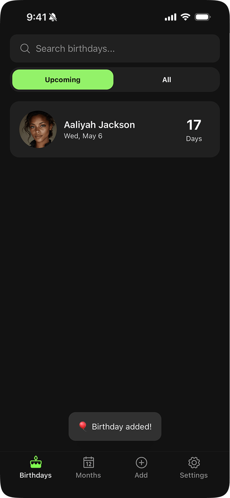 A birthday reminder app designed, built, and shipped solo across iOS and Android. A 15-year-old idea brought to life through AI-assisted development with Claude Code.