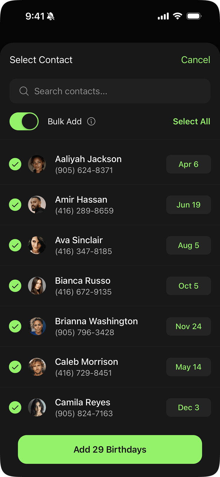 The worst part of any app that requires manual data entry is onboarding. You download it, feel good for five minutes, then abandon it because typing 70+ birthdays by hand isn't fun. Most apps accept it.
