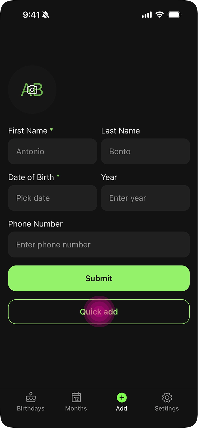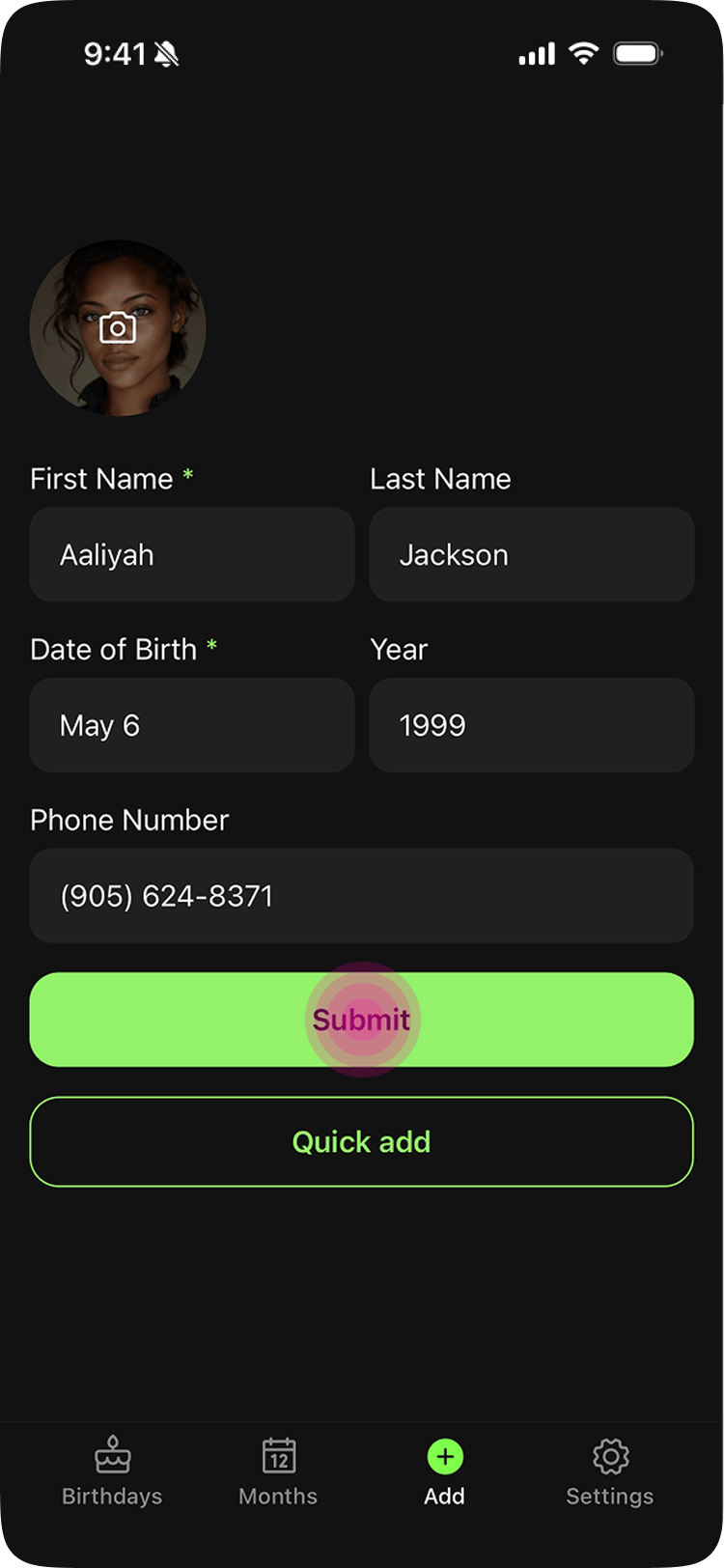 Piñata's answer was Quick Add. Instead of typing everything manually, you tap a contact from your phone or calendar, the birthday info pre-fills automatically, and you hit submit. No typing. Pro users can go further with Bulk Add, which lets them add multiple contacts at once.