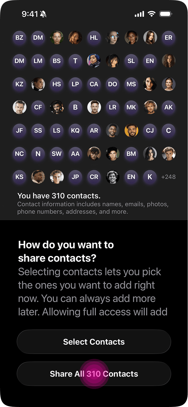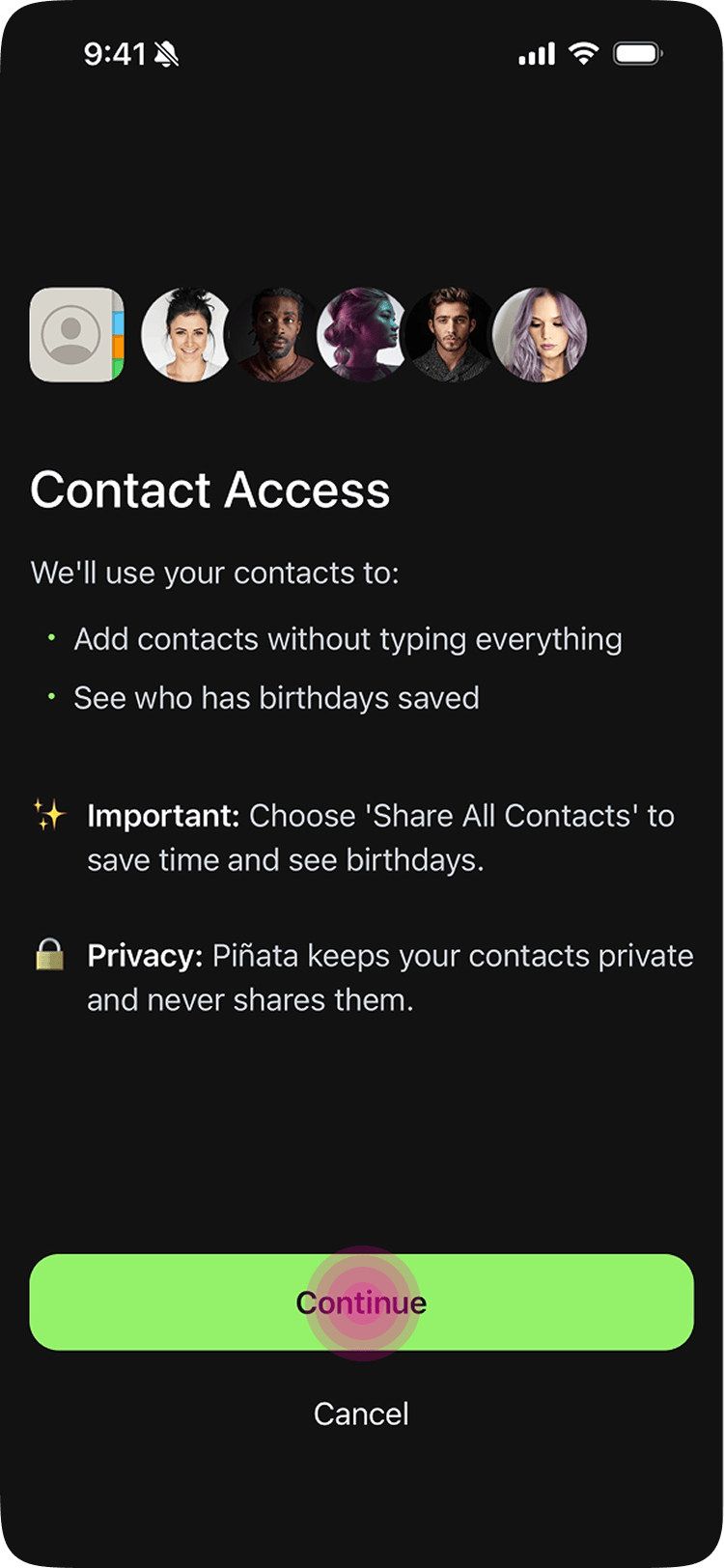 The fix was a custom screen that appeared before the native iOS prompt. It explained the value of full access, addressed the privacy concern directly (“Piñata keeps your contacts on your device and never shares them”), and nudged toward the better choice. Platform constraints aren't always engineering problems. Sometimes the right tool is copy.